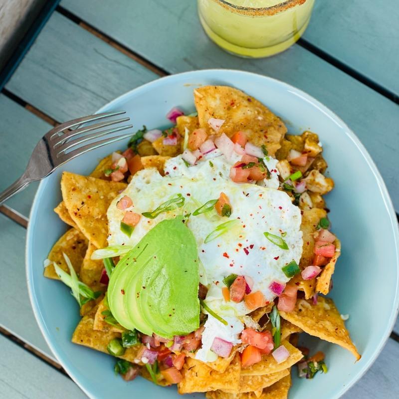 House Made Tortilla Chips, Two Eggs, Salsa Verde, Onions, Cilantro, SourCream, Avocado, Queso Fresco. Choice of Chicken or Steak 17