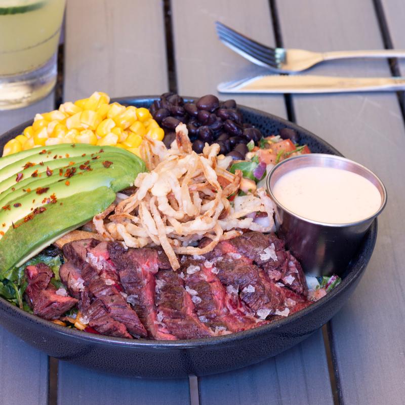 4 oz skirt steak, mixed greens, corn, black beans, pico de gallo, avocado, crispy shallots, tortilla chips, creamy Fresno dressing.