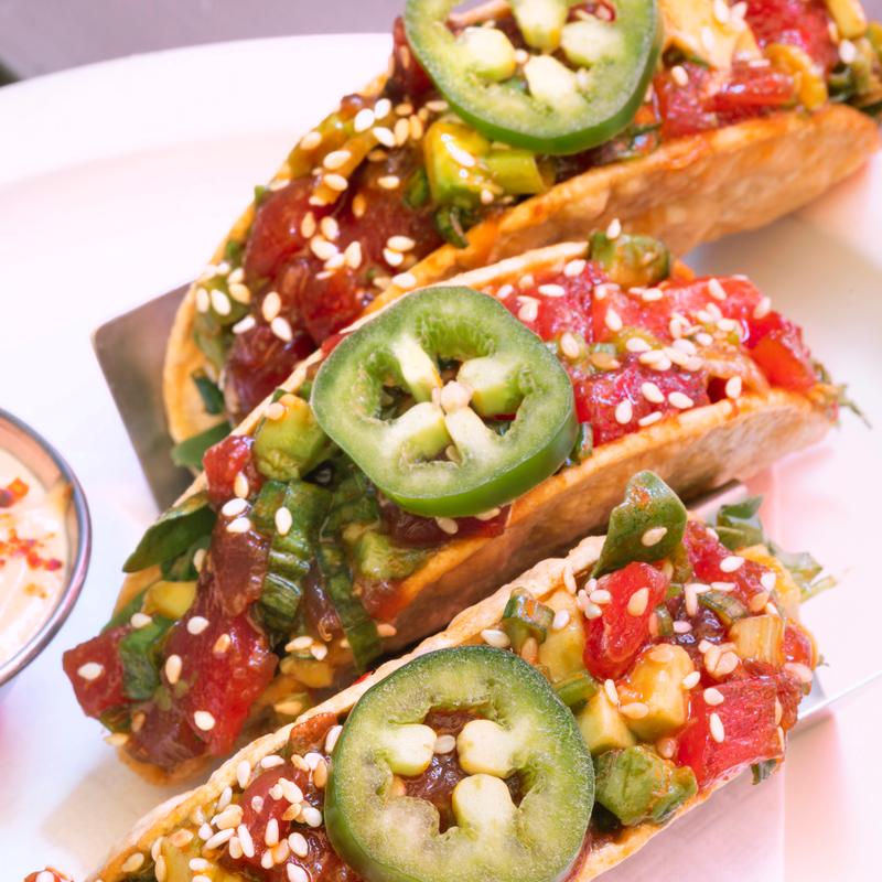 $6.00 | $18.00 • Ahi tuna tossed with scallions in soy-sweet chili ponzu sauce, arugula, avocado, chipotle mayo, in fried tortilla shell.