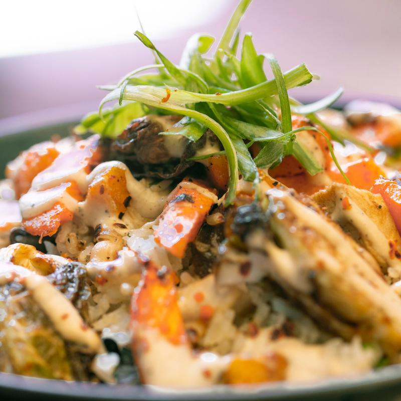 Jasmine rice sautéed with mushrooms, roasted brussels, butternut squash, carrots, and tahini with your choice of cumin chicken or falafel.